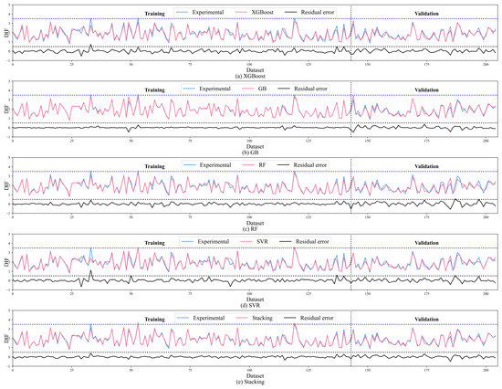 Figure 10 gives the predicted DIF of BFRC obtained by the five algorithms after optimizing the parameters using GA. In each diagram, the blue line depicts the actual DIF from the experiment, while the red line shows the DIF prediction from the ML algorithm. Additionally, the error for each sample is shown by the black line in each diagram. It was found that for most samples in the training set, the deviation between the predicted and actual values was relatively small, which indicates the good performance of the trained model. The larger deviations between the predicted and actual values in the test set compared to the training set can be seen in Figure 10. Among them, the RF model (Figure 10c) had the largest error fluctuation, and the stacking model (Figure 10e) had the smallest error fluctuation. The analysis’ findings demonstrate that the stacking model makes the most accurate predictions.