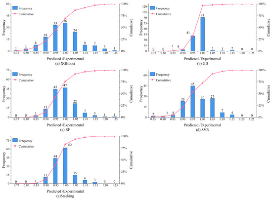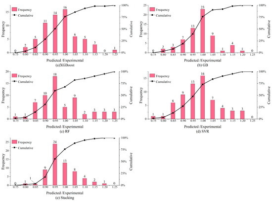 Figure 11 and Figure 12 depict the predicted-to-experimental ratio widely used as a statistical evaluation for a model [51,52,53]. It can be noted that for the training and validation data of the stacking model, 121/142 (85.2%) and 45/64 (70.3%) of the predictions were recorded within ±5% of the relative error. Similarly, the XGBoost model interpreted 93/142 (65.5%) and 32/64 (50%) of the predicted values as ±5% of the relative error. The GB model interpreted 134/142 (94.4%) and 36/64 (56.3%) of the predicted values as ±5% of the relative error. The RF model interpreted 114/142 (80.3%) and 36/64 (56.3%) of the predicted values as ±5% of the relative error. The SVR model interpreted 98/142 (69%) and 45/64 (70.3%) of the predicted values as ±5% of the relative error. The stacking model had a higher error accuracy of the predicted values in the training set with the highest error accuracy in the test set, proving its superiority in predicting the DIF of BFRC.