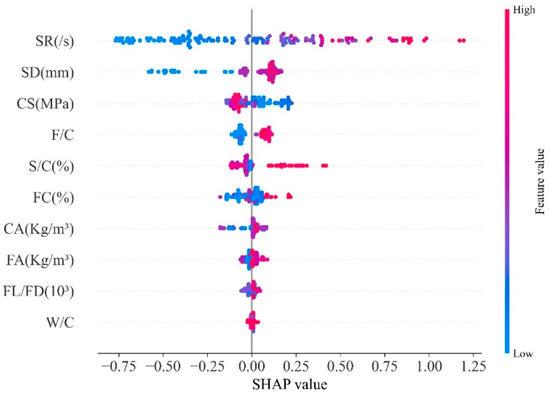 Figure 15 shows the global interpretation of the GB model by SHAP interpretation, showing the trend of the corresponding variables and the distribution of SHAP values for individual features. The X-axis indicates the SHAP values of the ten input features. Positive and negative SHAP values indicate the positive and negative gain of the DIF. Red dots indicate high feature values of the sample and blue dots indicate low feature values of the sample. From Figure 15, for SR, samples with higher values have positive SHAP values, which means that higher SR is beneficial for DIF. SD samples with higher values have positive SHAP values, indicating that an appropriate increase in specimen size can improve the DIF of BFRC. In a reversal of the observed trend for the SD samples, individuals with high sample values in the CS samples exhibited negative SHAP values, implying that a greater DIF was observed in BFRC with lower compressive strengths. Since summary plots summarize the relative importance of the input factors and how they relate to the independent variable, they play a crucial role in SHAP analysis.