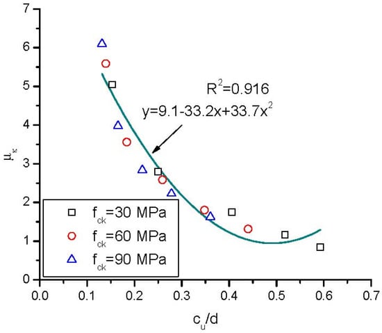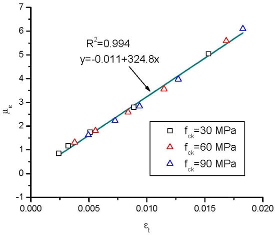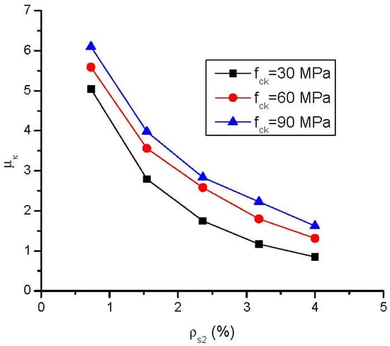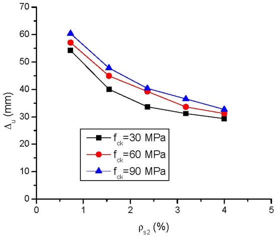 | fck (MPa) | ρs2 (%) | Pu (kN) | Δu (mm) | κy (10−6 rad/mm) | κu (10−6 rad/mm) | μκ | cu/d | εt (%) |