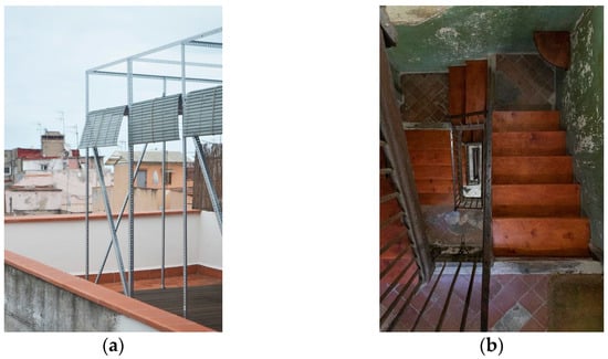 An innovative aspect from a constructive point of view is the application of the principles of dry construction, recyclability, demountability, and the use of low-cost construction systems that were taken into account in the development of these micro-projects in order to facilitate their implementation and replicability. In Figure 2a, we can see the installation of a gazebo based on these construction principles, which offers a meeting and care space for the neighbours, as well as a refuge from the high summer temperatures in terms of energy poverty. Pergolas on the roof provide a shaded and ventilated space that improves comfort conditions in summer, decreasing the need for energy consumption for cooling. Figure 2b presents another micro-project which was the installation of a removable and non-permanent wooden covering for the staircases. This solution was intended to solve accessibility issues, together with the help of hinged pieces at the corners of the landing to allow the needy to rest when climbing the stairs.
