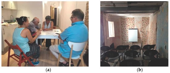 This public-private collaboration between the city council administration through the Pla de Barris and the owner of the dwellings was fundamental to carrying out this rehabilitation in an urban context, which, as has been said, is threatened by gentrification because of real estate speculation and tourist pressure. On the other hand, the involvement of several social agents from the neighbourhood and the architectural firm La Boquería was necessary to carry out the training courses at the construction site, the aim of which was to reintegrate into the labour market those people from the neighbourhood who were long-term unemployed. In parallel to this training, a support plan was drawn up with the future users to involve them in the design and decision-making process (Figure 3). La Boquería studio was in charge of designing the refurbishment projects for the three dwellings. The project stood out for the plurality of agents involved and the dialogue and collaboration between them, all decisive for the success of the initiative.