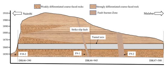 - Zhao, X.; Cheng, D.J.; Dai, Z.J.; Li, R.H.; Wang, Z. Influence of fault dislocation on water conveyance tunnel. J. Chang’an Univ. 2021, 41, 96–106. (In Chinese) [Google Scholar]