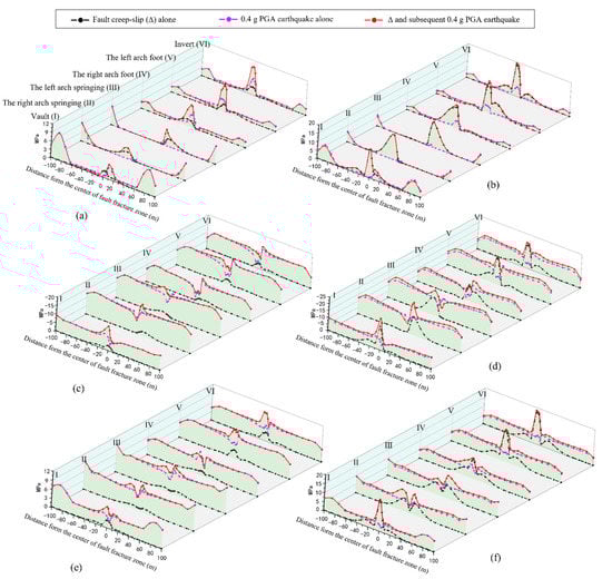 - Huang, J.; Chen, X.; Zhao, X.; Zhao, M. Nonlinear Response of Tunnels under Coseismic Displacement Induced by Strike-Slip Fault. Int. J. Géoméch. 2022, 22, 04022177. [Google Scholar] [CrossRef]