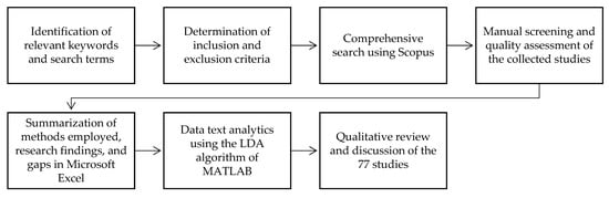 The MATLAB program was utilized for data extraction, where the collected studies were imported and processed. MATLAB uses the latent Dirichlet allocation (LDA) algorithm for data text analytics. LDA presents a generative probabilistic model of a distribution of words in a document belonging to a specific topic [40]. In the present study, MATLAB served as an assistive tool for analyzing the studies efficiently. It processed all the articles and identified similarities in the words and phrases used, which aided in highlighting the common themes among the papers. To begin this process, the titles and abstracts of the studies were exported using the CSV Excel feature in Scopus. This Microsoft Excel file was imported into MATLAB. The codes in MATLAB were then utilized.