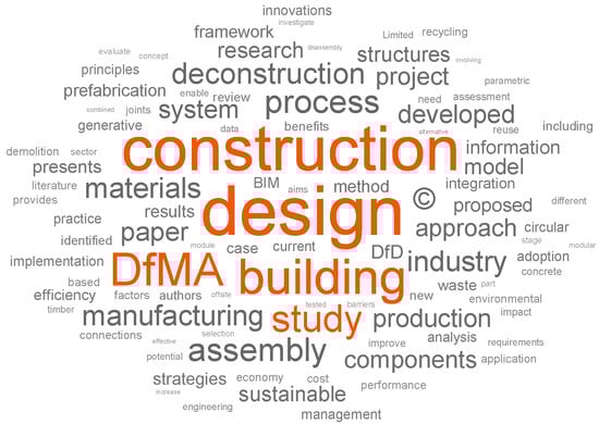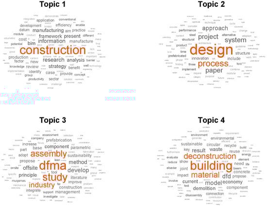 Figure 2 displays a word cloud containing the most frequently used words in the extracted documents. It provides an overview of the topics to be discussed. As can be seen, the most apparent words are “construction”, “design”, “DfMA”, “building”, and “study”, which verified the accuracy of the search terms used. Figure 3 provides the validation perplexity, which reveals how accurately a model explains a collection of documents [41]. The marks in the graph suggested that about four to eight topics would be suitable for the discussion. Hence, four topics were selected under which the studies’ subjects were categorized. Four topics were selected because this number was determined to be adequate for the review based on the themes and highlights of the studies identified. These specific topics are presented in Figure 4. Figure 5 displays the proportion of the topics in each document to help understand how these topics were generated. As can be seen, the topics were adequately distributed in all the documents. The corresponding interpretation of the developed topics is shown in Table 1. The first topic was interpreted to provide an overview of DfMA and DfD. This section introduces the development and background of DfMA and DfD. It also discusses the procedures implemented in employing these approaches. The two subsequent topics were easily comprehensible since “DfMA” and “deconstruction” were explicitly stated in the results. Hence, these topics were used to represent the principal discussion regarding the current state of DfMA and DfD in construction-related studies. Since the results generated can be given various interpretations, the last topic was chosen to emphasize the integration of DfMA and DfD in the construction industry. The selection of the studies under each document was based on the understanding and evaluation of the content of each article. After determining the topics, a qualitative review was undertaken as a basis for the discussion.