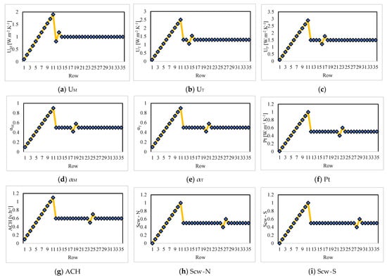 The values of UM, UT, UP, αM, αT, Pt, ACH, Scw-N, Scw-S, and Scw-E, and Glz range in [0.10, 1.90], [0.10, 2.50], [0.10, 2.90], [0.10, 0.90], [0.10, 0.90], [0.01, 1.00], [0.10, 1.10], [0.00, 1.00], [0.00, 1.00], [0.00, 1.00], [1.00, 5.00], [48.19, 188.94], [44.55, 546.98] with average values of 1.00, 1.30, 1.50, 0.50, 0.50, 0.51, 0.60, 0.50, 0.50, 0.50, 2.94, 96.15, and 69.53, respectively.