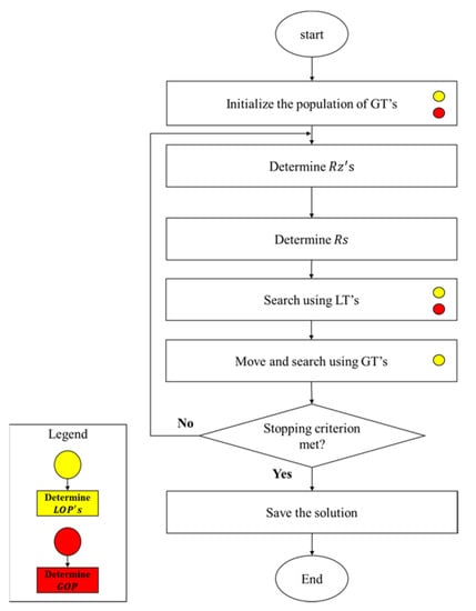 The MTOA algorithm has been designed and introduced by Zakeri, Moezi, Bazargan-Lari and Zare [] with regard to the merits and drawbacks related to other algorithms. Unlike other metaheuristic algorithms, this algorithm is not based on physical phenomena or the lifestyle of creatures. The MTOA consists of many population members, namely global tracker (GT) and local tracker (GT) randomly generated in the problem space. LTs are considered to be spreading around each GT because as convergence speed increases, the algorithm eludes the local solution along with positional searching about this GT. The search radius for each GT is specified according to each GT’s fitness level, as well as the distance from the global optimum point (GOP). Figure 2 shows the flowchart of the MTOA [].