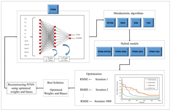 Since the selected algorithms are among the newest members of the metaheuristic family, there are few studies that have addressed the optimization of FFNN using them. For instance, Hu, et al. [] employed an ensemble of SOA with ANN for estimating the capacity of concrete-filled steel tube columns by considering the column’s characteristics. Wu, et al. [] introduced the combination of VSA and ANN as a potential hybrid tool for analyzing the heating load in residential buildings. Additionally, a SMA and ANN were synthesized by Lin and Wang [] for building energy performance analysis.