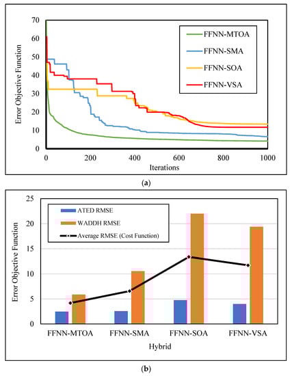 Figure 4 shows the optimization results. In Figure 4a the optimization charts are depicted for a total of 1000 iterations. All four models show great promise for reducing the error of FFNN training. Each algorithm follows a certain path of optimization. For instance, the MTOA has a smooth curve in comparison to the step-wise paths of the SOA and VSA. As explained, the objective function in this diagram is the average of the WADDH and ATED RMSE. For clarification, Figure 4b depicts the RMSEs separately.