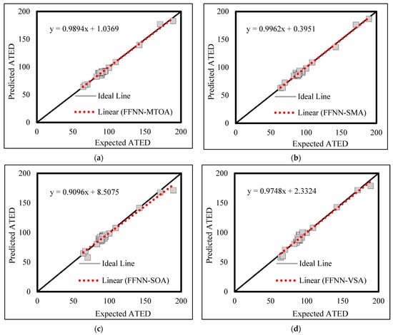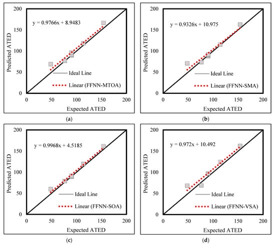 ATED correlation diagrams—Testing outcomes of (a) FFNN-MTOA, (b) FFNN-SMA, (c) FFNN-SOA, and (d) FFNN-VSA.