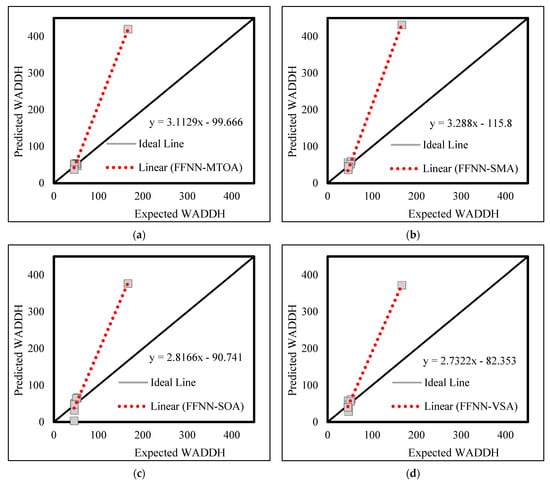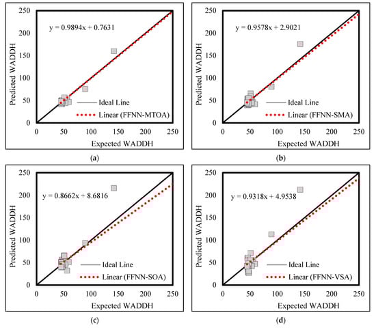 WADDH correlation diagrams-Training outcomes of (a) FFNN-MTOA, (b) FFNN-SMA, (c) FFNN-SOA, and (d) FFNN-VSA.