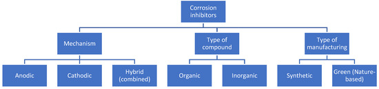Inhibitors are materials that prevent either oxidation or reduction processes. The corrosion inhibitors can be classified based on different criteria such as their mechanisms of action, types of compounds, or ways of production. Figure 1 summarizes a general classification of major corrosion inhibitors. According to the mechanism of corrosion inhibition, anodic inhibitors can hinder the anodic reactions by forming a protective oxide film on the metal surface. A successful application of the anodic inhibitors requires identification of the critical concentration of inhibitors since a low concentration of anodic inhibitors can accelerate corrosion.