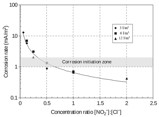 Influence of nitrite concentration (3, 6, 12 L/m3) on corrosion rate of reinforcing steel [20].