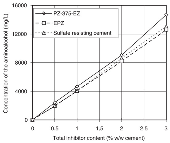 Amino alcohol in the pore solution in three different cement: normal Portland cement (PZ-375-EZ), Portland cement with 30 mass% blast furnace (EPZ), and sulfate-resisting cement versus total inhibitor content [65].
