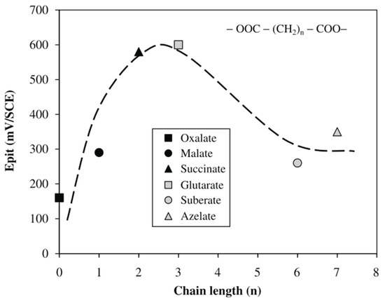 Pitting potential of the reinforcing steel with respect to chain length for bi-carboxylates [26].