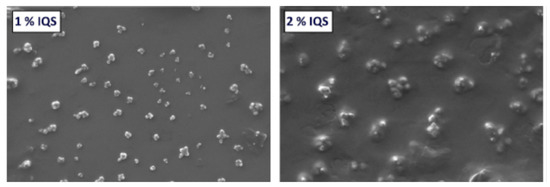 Heterocyclic inhibitors have a cyclic structure with a ring containing carbon, oxygen, nitrogen, and sulfur. The number of possible heterocyclic systems is unlimited since it is possible to produce different structures with these elements. However, the most common corrosion inhibitors with this structure belong to the imidazolines, thiazoles, triazoles, benzotriazoles, and pyrazoles [11,34]. This class of inhibitors can be used in very small concentrations to inhibit steel corrosion. Imidazolines are widely used in oil and gas industries, and it has been shown that they can effectively hinder corrosion in neutral, acidic, and alkaline conditions [35]. Fei et al. studied the effect of imidazoline quaternary ammonium salt (IQS) on the corrosion of reinforcing steel, and they found that this inhibitor can effectively increase the corrosion resistance and chloride threshold value for corrosion initiation. The performance of 2% IQS is slightly lower than 2% of sodium nitrite while it is much better than 2% of amino alcohol [36]. Furthermore, the concentration of IQS influences long-term corrosion protection. The SEM analysis indicated that increasing the concentration of IQS is associated with the agglomeration of IQS on the surface of the steel (Figure 5), which is not suitable for short-term corrosion protection. However, these agglomerated particles can disperse gradually and cover the active sites of the steel surface in long-term immersion.