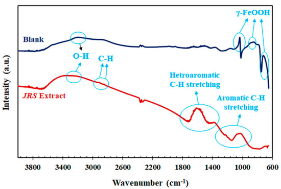 ATR-FT-IR spectra of the mild steel plates immersed in the test solutions containing JRS extract [45].