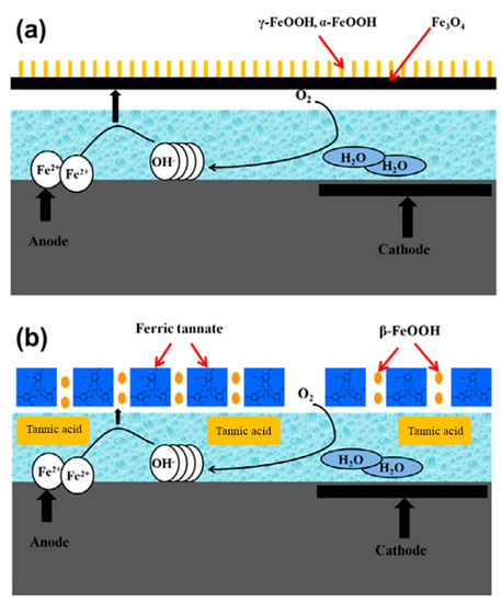 Schematic of the corrosion mechanism during wet/dry cyclic condition tests in seawater (a) and tannic-acid-containing seawater (b) [49].