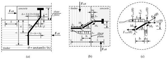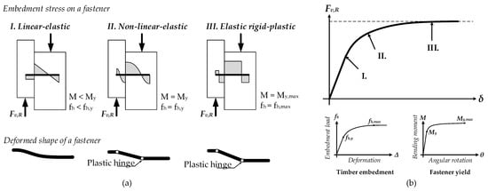 Additionally, the EYM theory implies a specific state when a failure in the connection occurs, i.e., a condition in which the simultaneous formation of plastic hinges and yield of timber and crushing of concrete arise under the assumption shown in Figure 1a. For a particular type of connection failure (failure modes), the EYM determines the position of the maximum moments in the fastener, which also represents the location of the plastic hinges or the location of the fastener rotation. Based on the assumed development of the connection failure (Figure 1a), it is possible to determine the complete load–slip curve (Fv,R-δ) on the considered displacement domain (Figure 1b).