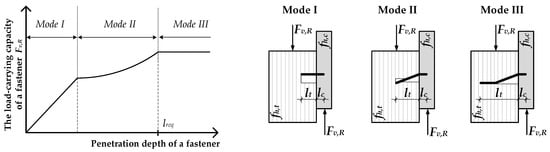 In the case when the connection is assembled with different materials (represented by the embedment strength of the materials fh,t ≠ fh,c), the transition from Mode II to Mode III must satisfy the requirements regarding the embedment depth of the screw in timber (lt,req) and concrete (lc,req) []: