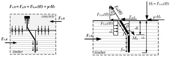 - The influence of the axial force in the screw Fax,f = Frope′ + Frope″, where Frope′ = Fy,R − FJoh is the force that increases the indentation zone in timber when withdrawal capacity is activated (increasing bt), while Frope″ = Fh,ax(θ) is the force that represents a further expansion of the indentation zone beyond the plastic hinge in timber;