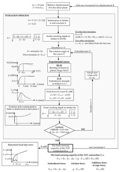 The above equations represent the algorithm for calculating the load-carrying capacity of a connection for one screw. For obtaining the complete load–slip curve on the entire domain, an iterative procedure must be carried out for predefined displacements S in connection. The maximum displacement δmax on the considered domain in the proposed model in the amount of 15 mm was adopted according to Dias [], which stated that for this slip, the maximum load is always reached, and the assumption is only valid for the TCC connection made with dowel-type fasteners. For a more straightforward interpretation of the proposed procedure, a summary of the calculation process can be seen on the flow chart in Figure 5.