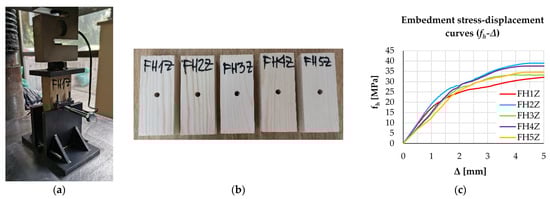 Determination of the embedment properties parallel to the grain: (a) the setup of the embedment test, (b) timber specimens, and (c) fh − Δ curves obtained experimentally.