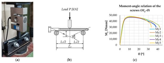 The procedure in accordance with ISO 10984-1 (Method B) was applied to determine the yield bending moment of the screw, via three-point bending test, with a distance of supports equal to L0 = 80 mm (Figure 7b). The test was carried out on 5 specimens, where the force was applied at a speed of 2 mm/min. Using recorded data of the screw displacement in the middle of the span u and the applied force P, the relationships My − θ (with labels My1 to My5, for all tested screws, Figure 7c) were determined according to Equation (7) for the yield moment, and Equation (8) for the rotation angle.
