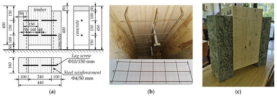 In this study, double shear test specimens were adopted (concrete–timber–concrete), consisting of 1 central timber (160 × 240 × 400 mm) and 2 side concrete (160 × 100 × 400 mm) members connected with 2 timber screws 10 × 150 mm in each shear plane at a distance of 150 mm (Figure 8a). Concrete was reinforced with steel mesh reinforcement Φ4/50 mm in the bottom zone at 20 mm from the timber member (Figure 8b). Three shear test specimens were made for this study (Figure 8c). Before forming the test specimens and placing them in the formwork, the timber member was conditioned at 20 °C/65%, and during the shear test, the timber humidity was 10.9%. After pre-drilling the holes with a core diameter of 7 mm (din) in timber, the screws were installed manually with a wrench. A plastic sheet was placed between timber and concrete, which reduces the effects of friction and prevents water penetration into the wood from concrete.