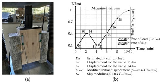 The shear tests were conducted based on the loading protocol from EN 26891 (Figure 9b). At first, the test specimens were loaded up to 40% of the estimated ultimate load (Fest). The applied load was kept constant for 30 s. After that, the load was reduced to 10% Fest and kept constant for 30 s. The load was increased to 70% Fest with a rate of 20% Fest per minute. Finally, the displacement control mode was adopted to apply the further load until the occurrence of either failure or a 15 mm displacement.