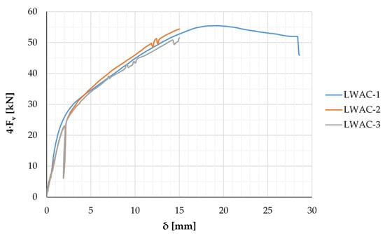 Shear test specimens were tested according to a protocol given in EN 26891 that requires the estimated maximum load Fmax,est based on which the loading is carried out. In this study, the first test specimen was tested to accurately assess the maximum load (Fmax). The other two test specimens were tested according to the adopted loading procedure in Figure 9b. Although the first test specimen was used for a more accurate estimation of the maximum load, using Johansen’s expression for Mode III and experimental values of the mechanical characteristics of the material, the calculated estimated load (in the interval of 40.7 to 55.6 kN) was in agreement with the first tested specimen. As EN 26891 prescribes that the test should be carried out when the ultimate load is reached or when the slip is 15 mm, the first test specimen was tested up to a slip of ~30 mm, while the remaining 2 test specimens were tested up to the slip of 15 mm. This ensures that the maximum capacity is reached and shows the composite connection behavior beyond the proposed slip. The experimentally obtained load–slip curves for all tested specimens (with labels LWAC-1 to LWAC-3) are shown in Figure 10.