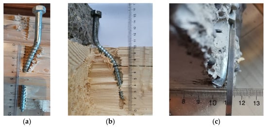 To show the failure mode of the screw and the damage to timber and concrete, parts of the timber and concrete were removed after the test. All tested specimens showed ductile behavior, i.e., during the screw indentation in the timber, a maximum embedment strength was reached, and two plastic hinges were formed in the screw (Figure 11a), as was expected at the given outset in the design of specimens to ensure a ductile-type failure of the connection. Although the first specimen was tested for slips beyond 15 mm (Figure 11b), it can be observed that there is no crushing in concrete around the screw, shear failure of the screw, or timber splitting. Figure 11c shows that the screw is pressed into the concrete and that the proposed approximation of neglecting the deformations in concrete is inappropriate. This fact implies that attention should be paid to this assumption, especially when LWAC with lower density classes than D1.6 are applied [].
