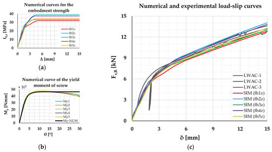 In order to determine and evaluate the behavior of the composite connection using the proposed numerical model, a code was written in MATLAB according to the given algorithm. Based on the experimental curves for the embedment strength of timber and yield moment of the screw, numerical curves for simulations of the TCC connection were formed. Numerical curves for embedment strength fh − Δ (with labels fh1z to fh5z) were obtained based on the assumption that hardening after the yielding was negligible for the indentations above 5 mm, i.e., the horizontal branch of the curve was added to the experimentally determined curves (Figure 12a). As the experimentally obtained yield moment curves My − θ (My1 to My5) are uniform in behavior, the mean curve My-NUM (Figure 12b), with a horizontal branch after the maximum moment, was adopted for the numerical curve of the screw yield moment. Five numerical simulations (with names SIM(fh1z) to SIM(fh5z)) were carried out to validate the proposed model, in which the numerical embedment curves fh − Δ (fh1z to fh5z) were varied, while the mean curve of the yield moment of the screw My − θ (My-NUM) was the same for all simulations. All simulations were carried out up to the slip of 15 mm, and Figure 12c shows superimposed experimentally (LWAC-1 to LWAC-3) and numerically (SIM(fh1z) to SIM(fh5z)) obtained load–slip curves Fv,R − δ to compare the results.