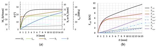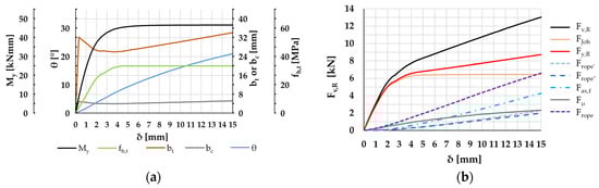 In addition to the numerically determined curves shown in Figure 12c, the following diagrams for simulation 3 (SIM(fh3z)) are superimposed and shown in Figure 13a: bt (crushing depth in timber), bc (crushing depth in concrete), θ (screw rotation angle), My (yield moment of the screw), and fh,t (embedment strength in timber) as functions of the connection displacement δ in the shear plane. To perceive the contribution of forces to the increase in the load-carrying capacity of the connection (in addition to the final value Fv,R, and Johansen’s part FJoh without rope effect), the following contributions of forces are shown in Figure 13b: