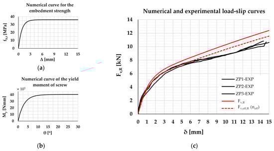 Experimental and numerical curves: (a) embedment strength in timber, (b) yield moment of the screw, and (c) load–slip curves of the connection (with 4 screws).