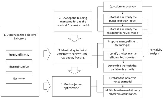 This study aims to explore the technical optimization scheme of ultra-low energy housing that meets the multiple objectives of energy saving, thermal comfort and economy, by using a probabilistic model of residents’ energy use behavior in the Hot Summer and Cold Winter Zone of China, in order to provide more reliable research and technical bases for the promotion of ultra-low energy housing in the region. In terms of behavior model, this study overcomes the limitations found in previous studies, by taking into account the stochastic nature of residents’ energy-use behavior and the influence of the interaction between environment and behavior on energy consumption and economy, such as using a conditional probability model based on regional survey results to construct a typical model of residents’ energy use behavior. In terms of a multi-objective optimization method, NSGA-II, a Pareto-dominance multi-objective algorithm is used to carry out the study. Materials and methods applied in the study are discussed in the following section.
