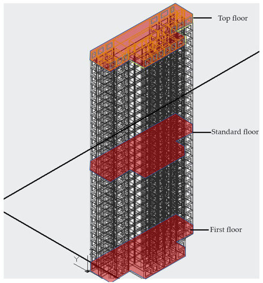 The most frequently occurring characteristics of orientation, building form, number of households per floor, number of bedrooms and living rooms, and house area were selected as the parameters of the building archetype for this study. Based on the literature review, questionnaires and market survey, drawings of nearly 100 new residential buildings were collected to define the archetype. It was found that the most popular characteristics are north–south orientation, high-rise slab-type, two staircases and four households per floor, three bedrooms and two living rooms, and 90–100 m2 per single-family. Parameters such as the window-to-wall ratio should meet the requirements of DBJ 43-2017 Design standard for energy efficiency of residential buildings in Hunan province [9]. An archetype was finally obtained and its simplified plan for a standard floor is shown in Figure 2. For speed of simulation, only the standard floor, ground floor (first floor) and top floor are modelled in this study (Figure 3). The window-to-wall ratios are 0.35 and 0.32 for the south and north facades, respectively, with no windows on the east and west walls.