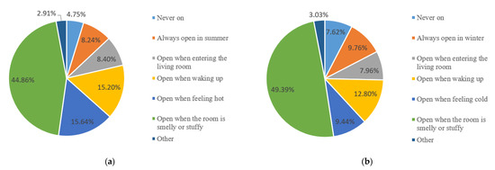 Selected results of the questionnaire surveys are shown in Figure 5, Figure 6, Figure 7 and Figure 8. For window opening and closing behaviors, the research results (Figure 5 and Figure 6) show that the patterns are basically the same in summer and winter. The window opening behavior is mainly influenced by indoor environmental factors, so it is described by the “feedback type conditional probability model”, where u is 700 ppm. Window closing behavior is mainly triggered by outdoor environment (noise, wind, rain, dust) and time factors, such as closing a window when the outdoor environment is bad, or when leaving home. Due to the lack of data on outdoor noise and dust concentrations, the window closing model only considers the working condition of closing when leaving home, and the value of p is 0.9 in the probability model in Table 5.