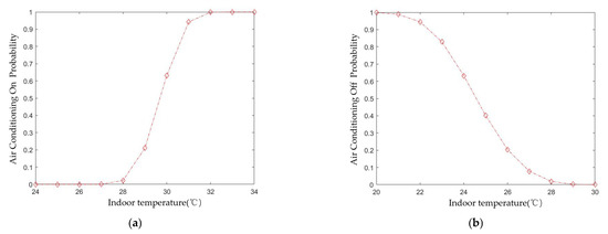 When determining probabilistic model parameters for energy use behavior over a wide range, the “time-based” model often estimates p values according to the literature or experience, with values of 0.9 for frequent events and 0.1 to 0.2 for infrequent events [33]. The “feedback type” refers to the “two-point” method of Zhang [23] to determine the occupant energy use behavior curve of air conditioners. For example, if the probability of turning on the equipment is assumed to be 0.9 at a certain environmental threshold, and 0.1 at a certain environmental value when people feel comfortable, then these values can be substituted into the model to obtain the relevant parameters.