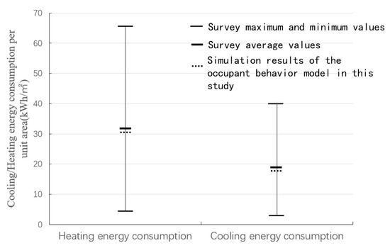 The above behavior model is input to the Dest model to obtain the annual cooling and heating energy consumption. By collecting monthly electricity consumption data from the residents surveyed by questionnaires, combined with literature research, the actual building energy consumption, heating and cooling energy consumption and energy efficiency data were obtained to verify and validate the model.