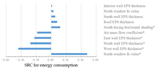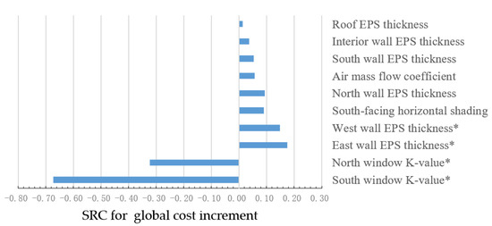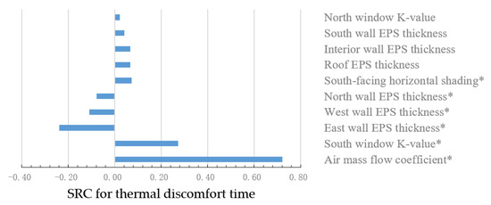 In this study, sensitivity analysis was used to screen the energy efficient technologies in order to reduce the volume of the optimization model. It would be time consuming and labor intensive to perform traversal calculations for 10 energy efficient technologies at multiple energy efficient levels as shown in Table 6, so this study used Latin hypercube sampling (LHS) to generate representative case samples, where the number of samples should be more than 1.5 times the number of variables, thus creating 130 combinations of energy efficient technologies. Research [47] has proved that equipment type is one of the key parameters affecting energy consumption and cost increment, so equipment type, such as the air conditioner, is taken as one of the key technologies in this study, without passing the screening step. The 130 combinations together with the occupants’ energy use behavior model were input to Dest to obtain the predicted energy consumption and indoor thermal discomfort hours. Then, a regression-based global sensitivity [53] analysis was conducted to analyze the importance and significance of building energy consumption and indoor thermal discomfort hours, and the global cost increment influenced by the technical parameters of building energy efficiency based on standardized regression coefficients (SRC) and significance p. Finally, the energy efficient technologies with significant impact on energy consumption, indoor thermal discomfort hours, and cost increment indexes were selected as key parameters.