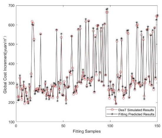The objective function was trained with the BP model, which is a type of neural network model. The relationship between global cost increment and key technical variables is with a goodness-of-fit not greater than 0.53 when described by a neural network model, regardless of how the hidden layer neuron number is changed, and a goodness-of-fit of 0.97 when using polynomial regression (Figure 15), of which the average relative error is 1.89%. Therefore, the global cost increment is regressed using the polynomial model, as follows: