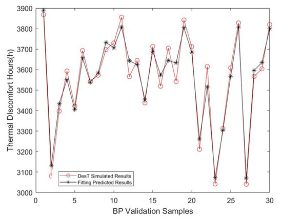 When the objective function is energy consumption and indoor thermal environment with two neural network models, the input layer contains eight neurons (key technical variables screened in Section 3.2.1), the number of hidden layer neurons is three, and the output contains one neuron (energy consumption or indoor thermal discomfort time), the objective function models have the relatively best agreement with the calculated results of Dest simulation, and the results are shown in Figure 16 and Figure 17. It can be seen that the average relative errors of energy consumption and indoor thermal discomfort time are 0.46% and 1.54%, respectively, and the R2 values of the BP models of the key technologies with energy consumption and indoor thermal discomfort time are larger than 0.98. As shown above, the fit of the objective function models with the calculated results from Dest simulations is good.