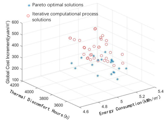 In this study, to reach the objectives of reducing building energy consumption, ensuring indoor thermal comfort and reducing cost increment, NSGA-II is used to optimize the objective functions, consisting of key technical variables, energy consumption, indoor thermal discomfort hours and cost increment, to obtain the Pareto optimal solution set.