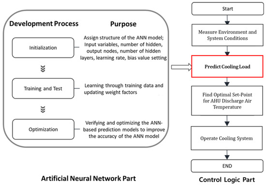 The building sector represents one of the largest consumers in the US [1]. Energy consumption for heating, ventilation, and air-conditioning (HVAC) systems is approximately 50% of the total energy consumption of the building sector [2]. Therefore, to reduce building energy, it is essential to reduce heating and cooling energy consumption. To do so, the American Society of Heating, Refrigerating, and Air-Conditioning Engineers (ASHRAE) continuously improves the insulation performance of buildings by lowering the U-value of walls and windows every three years. However, in the case of enhanced insulation performance, such improvements are introduced through retrofitting or in new buildings. It is important to control the HVAC systems that are already installed in the existing building for building energy savings without retrofitting. However, since most of the existing control methods of the HVAC system are time-based control, optimal control may not be achieved. Therefore, the existing HVAC control method is difficult to predict for the control of the future state of HVAC systems by simultaneously considering variables that affect building energy consumption [3,4,5]. To predict and control the future state of the HVAC system, an artificial neural network (ANN)-based HVAC control is required [3,4,5]. In addition, ANNs enable accurate prediction through adaptability to external changes. They enable accurate and efficient control [5]. Previous studies using predictive models to properly control HVAC systems are described as follows.