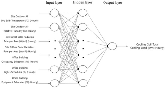 Seven input variables that displayed a high correlation with the cooling coil’s total cooling load were selected for the model. The seven input variables are outdoor air dry-bulb temperature, outdoor air relative humidity, direct solar radiation rate per area, diffuse solar radiation rate per area, occupancy schedule, lights schedule, and electric equipment schedule.