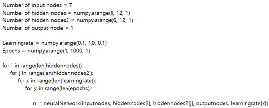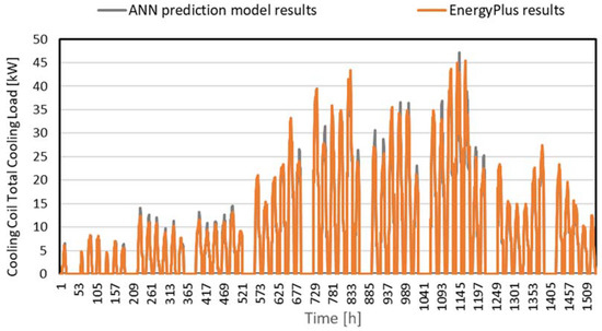 The optimization of the ANN prediction model involves identifying the ideal values for hyperparameters such as learning rate, hidden nodes, epochs, and the number of hidden layers to improve prediction accuracy. Currently, there are no established methods for determining optimal hyperparameter values, and it is best to adjust these values iteratively based on the results. In this study, around 160,000 attempts were made to optimize the ANN prediction model. Python was used to conceptualize the optimization process, and the combination with the lowest cv (RMSE) value was chosen based on a comparison of EnergyPlus simulation results with the cooling coil total cooling load predicted by the ANN model. Table 4 shows the optimized hyperparameter values and their input range, with the cv (RMSE) value decreased from 24.07% to 8.44%. Therefore, it was determined that the optimized ANN prediction model is suitable for HVAC optimal control. Figure 5 shows the structure of Python programming code for the optimization process and Figure 6 illustrates a comparison of the simulation results and those predicted by the ANN prediction model.