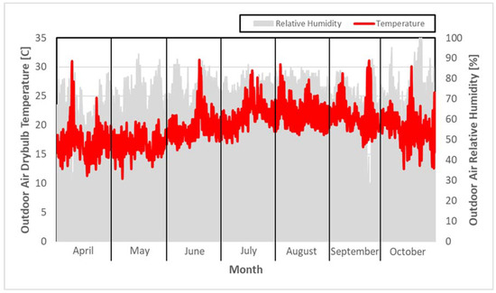 This study used weather data provided by EnergyPlus from the Brown Field Municipal Airport, one of the cooling-dominated regions. Brown Field Municipal Airport is in Southern San Diego, CA, USA. The analysis period in this study is the intermediate and cooling seasons, which is from April to October, to understand the free cooling and cooling effect of the economizer. April, May, September, and October are selected as the intermediate season, and June, July, and August are selected as the cooling season. Figure 7 shows the outdoor air dry-bulb temperature and relative humidity in San Diego, CA, USA. The range of the outdoor air dry-bulb temperature during the analysis period is 10.8–31.2 °C, and the range of the outdoor air relative humidity during the analysis period is 7–100%. The analysis period is 5136 h. Observing the outdoor air relative humidity, 4831 h is more than 50% of the outdoor air relative humidity, which is 94% of the total analyzed period.