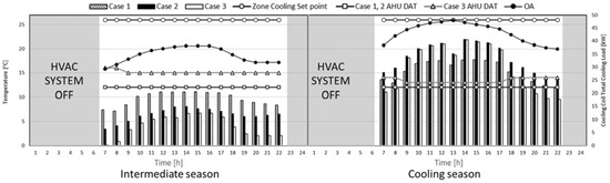 This paper uses 15 May as a representative day of the intermediate season and 11 August as a representative day of the cooling season. Representative days were chosen because they represent the average outdoor air temperature in the intermediate and cooling seasons. Figure 8 shows the change in AHU-DAT according to the cooling coil’s total cooling load during the representative days in the intermediate and cooling seasons. The cooling load pattern is similar to outdoor air temperature in all three cases. Since the cooling system operates from 7 a.m. to 10 p.m. in all cases, there is no cooling load from 11 p.m. to 6 a.m. In the case of the AHU-DAT value, it was found that Cases 1 and 2 were tightly controlled at 12 °C regardless of changes in the cooling load, and in Case 3, AHU-DAT is controlled by fluctuating within the range of the maximum of 16 °C to the minimum of 12 °C as the cooling load changes.